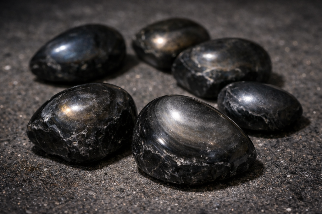 (エクリプスオブシディアン、日蝕石とも呼ばれる)エクリプスストーンは、黒を基調に控えめな光を帯びる石で、内省・精神防御・冷静な判断力を象徴するパワーストーンとして知られています。